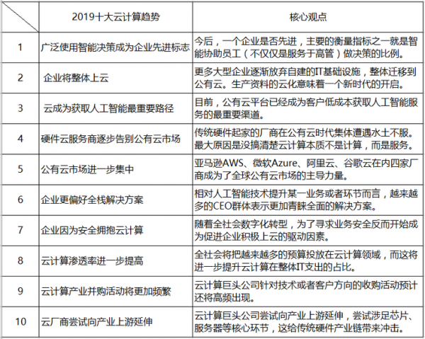 中国云计算经历10年发展,已经广泛服务于社会经济。市场上,出现阿里云这样跻身全球前三的云服务商。应用方面,城市大脑、智慧工厂、农业AI等项目颇为亮眼,为下一轮数字经济的全面铺开打下基础。面向2019年,记者广泛采访了业内人士、分析师和企业决策层,对云计算产业新一年的发展趋势作出十大预测。