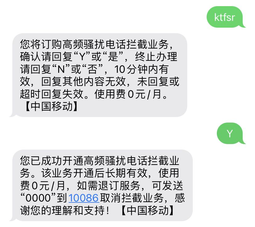 发送“开通防骚扰”首字母“KTFSR”到10086即可免费开通高频防骚扰电话拦截业务