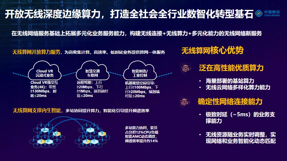李男进一步分享了从无线云网到无线算网的演进思考,无线算网在功能、性能、成本方面优势明显,满足大多数边缘计算场景需求,为高密集计算、高速率、低时延业务提供算网一体服务。同时,多站之间通过算力共享和协同,可有效满足无线网络内生智能的算力需求,帮助进一步提升网络性能、资源利用率和用户体验。