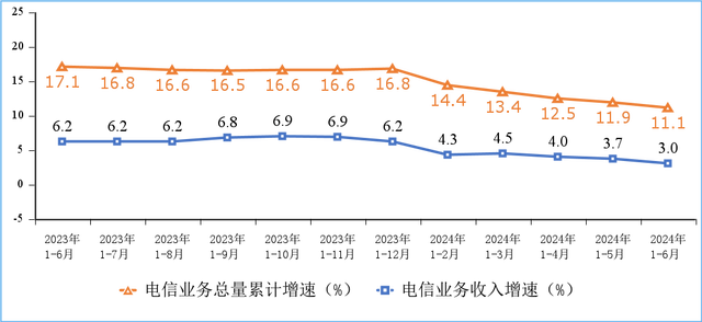 C114讯 7月23日消息 工信部今日发布2024年上半年通信业经济运行情况,上半年,电信业务收入累计完成8941亿元,同比增长3%,增速较一季度下降1.5个百分点。按照上年不变价计算的电信业务总量同比增长11.1%。 固定互联网宽带业务收入平稳增长。上半年,三家基础电信企业完成互联网宽带业务收入1365亿元,同比增长5.4%,占电信业务收入的15.3%,占比较一季度提升0.4个百分点,拉动电信业务收入增长0.8个百分点。 移动数据流量业务收入小幅回落。上半年,三家基础电信企业完成移动数据流量业务收入3280亿元,同比下降2.3%,占电信业务收入的36.7%。 新兴业务收入较快增长。三家基础电信企业积极发展IPTV、互联网数据中心、大数据、云计算、物联网等新兴业务,上半年共完成业务收入2279亿元,同比增长11.4%,占电信业务收入的25.5%,拉动电信业务收入增长2.7个百分点。其中云计算和大数据收入分别同比增长13.2%和58.6%,物联网业务收入同比增长12.5%。 语音业务收入持续下滑。上半年,三家基础电信企业完成固定语音和移动语音业务收入96.3亿元和552.4亿元,同比分别增长0.8%和下降3.4%,共占电信业务收入的7.3%,占比同比回落0.4个百分点