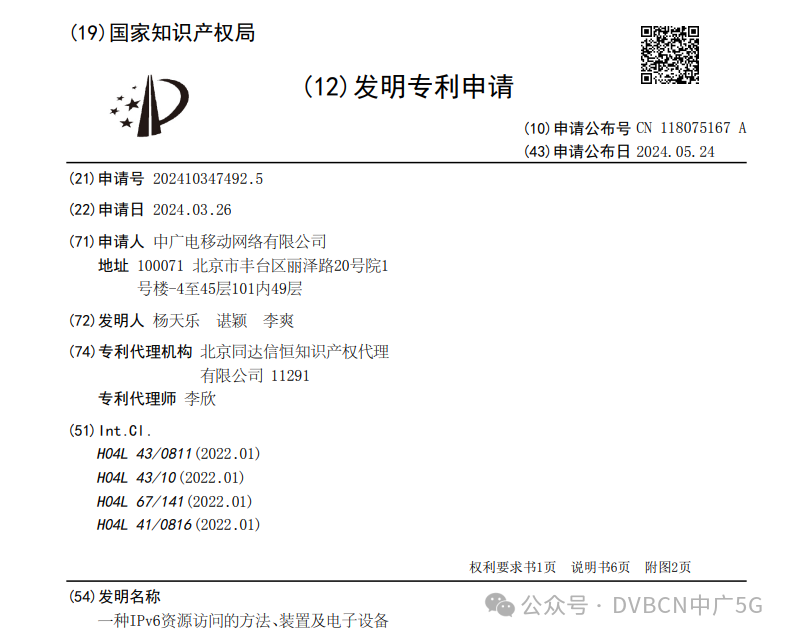 该专利名称为——一种IPv6资源访问的方法、装置及电子设备,申请日为2024年3月26日,申请公布日为2024年5月24日,申请人为中广电移动网络有限公司,发明人包括杨天乐、谌颖、李爽。