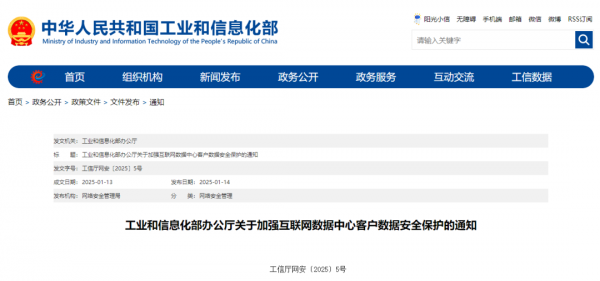1月14日,工信部网站发布《工业和信息化部办公厅关于加强互联网数据中心客户数据安全保护的通知》(下文简称“通知”),提出“权责一致、分类施策、技管结合、确保安全”的原则,要求IDC业务经营者加强客户数据安全保障能力建设,提升客户数据安全保护水平,以维护经济社会稳定和国家安全。
