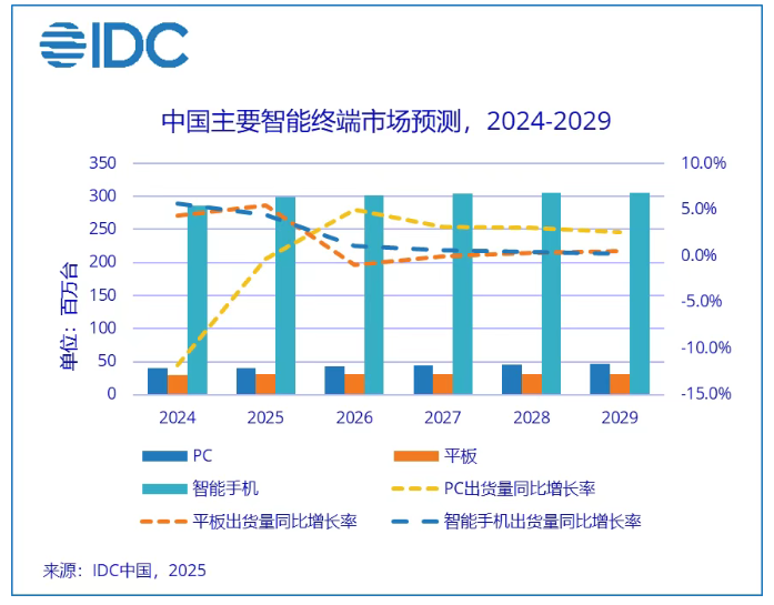 IDC最新发布数据预计,在中国市场上,PC、平板和智能手机出货量未来五年复合增长率将分别实现2.6%,1.0%和1.3%。伴随华为、联想、荣耀、OPPO、vivo等终端厂商纷纷接入DeepSeek,其终端设备的智能化水平将通过自然语言处理和多模态推理能力,实现更流畅的语音交互和更智能的自动化控制,并且加速AI终端应用落地。